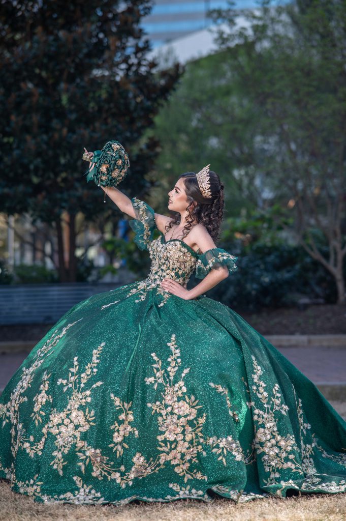 Los accesorios de una quinceañera son más que simples complementos. De hecho, son el toque final que eleva todo el atuendo y resalta el estilo de la celebración. En esta imagen, vemos un par de sandalias doradas sobre un vestido verde esmeralda lleno de detalles brillantes. Sin duda, esta combinación es perfecta para un look de glamour y elegancia.
